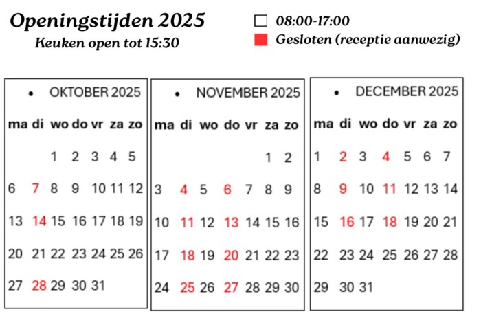 Openingstijden met de kerstvakantie 24 december t/m 5 januari zijn dagelijks van 8 tot 16.00 uur.